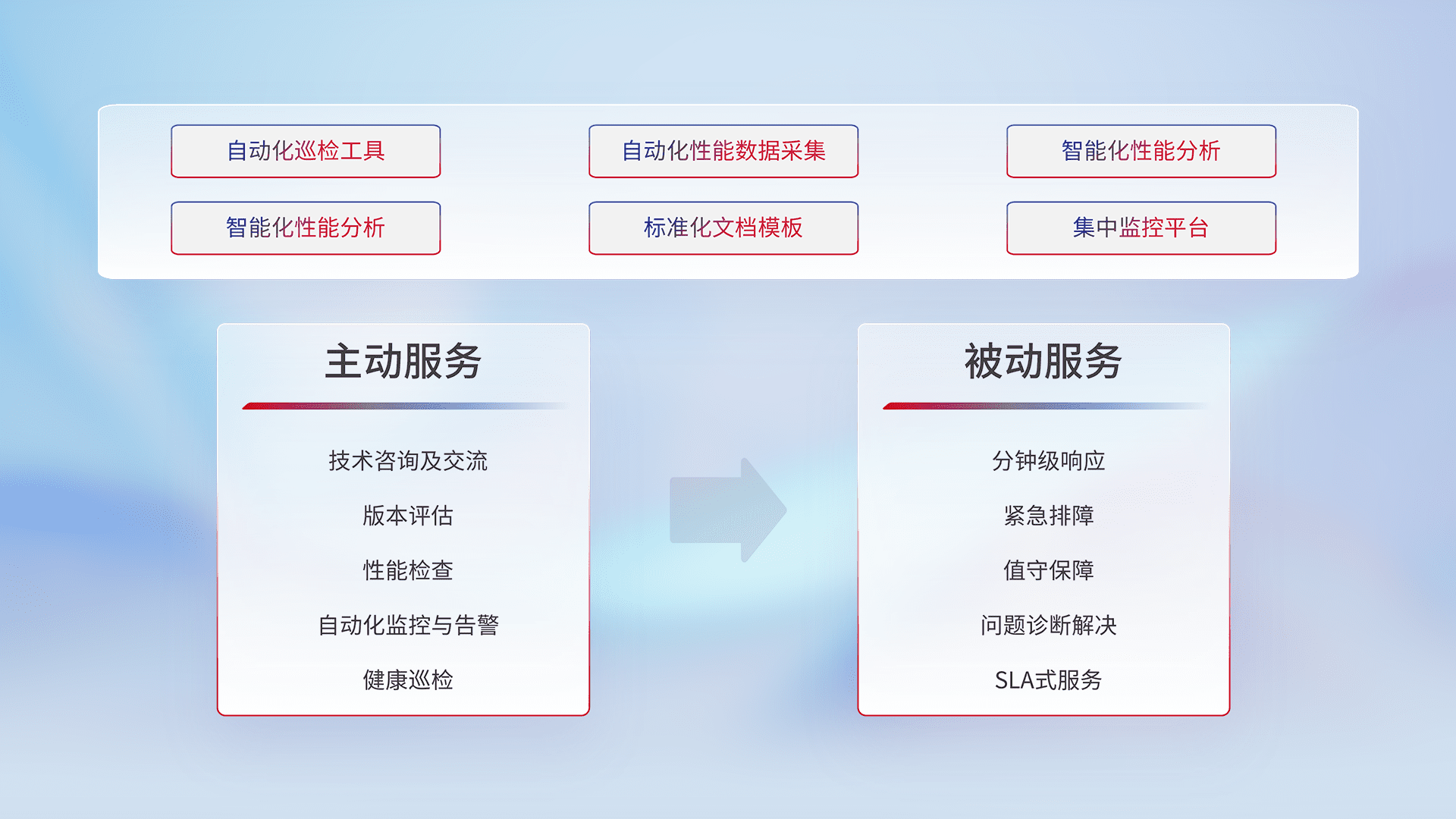 智能化工具和标准化文档,,,,保障服务质量,,提供主动服务(包含技术咨询、、、、版本评估、、性能检查、、、、自动化监控与告警、、、健康巡检)和被动服务包含(分钟级响应、、、紧急排障、、、值守保障、、、、问题诊断解决、、、、SLA服务)。。。。